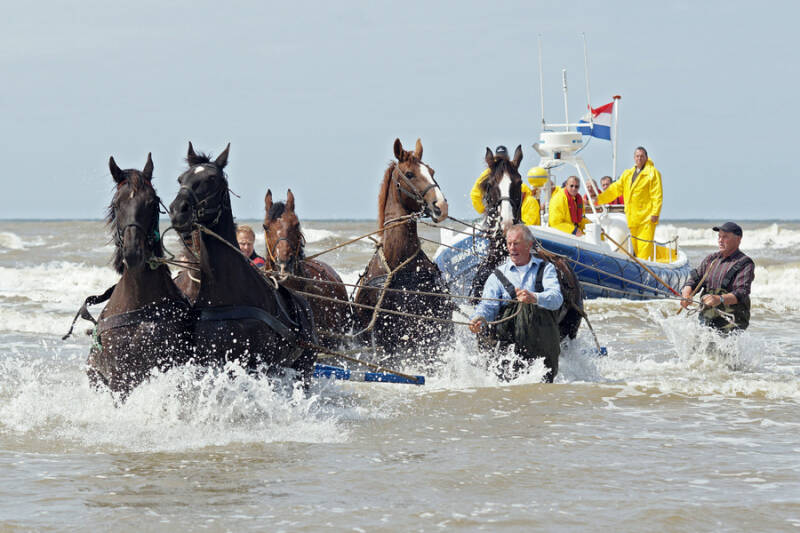 Tijdens de demonstratie van de paardenreddingboot op Ameland trekken 10 stoere paarden de reddingboot met donderend geweld over het strand en door de branding in zee.